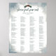Dieses alphabetische Sitzdiagramm zeigt Kiefernzapfen mit Kiefernbäumen mit blauem Aquarellhintergrund. Die perfekte Wahl für eine lässige Hochzeit im rustikalen Stil.