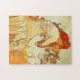 Alphonse Mucha Sommerpuzzle. Ölmalerei auf Leinwand aus dem Jahre 1896. Während seiner gesamten Karriere malte der tschechische Künstler Alphonse Mucha häufig allegorische Abbildungen der Jahreszeiten. Der Sommer 1896 ist aus einem kompletten Vierjahreszeitalter Set und hat eine schöne junge Frau mit hellbraunem Haar, die sich auf einer Weinrebe am Flussufer anlehnt, während sie sich ins Wasser taucht. Sie trägt ein dünnes, weißes und große rote Blume im Haar. Ein wunderschönes Geschenk für die Fans von Alphonse Mucha, Jugendstil und Vintage Drucke.