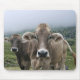 Ein Foto von zwei braunvieh alpinen Kühen mit den flaumigen Ohren auf einem nebelhafter Gebirgshintergrund.