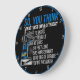 Diese Wanduhr unterstreicht die komplexe Realität, ein Lastwagenfahrer zu sein, über das bloße Fahren hinaus. Vor einem schwarzen Hintergrund mit blauem Rand zeigt es eine blaue LKW-Illustration. Der Text "ALSO, DENKEN SIE, DASS ICH EINFACH EINEN LKW FAHRE? 13 GEARS 18 WHEELS 40 TONS 54 FEET LONG 500 HORSEPOWER 1800 LBS OF TORQUE YOU DO THE MATH!" wird gezeigt, unter Betonung des Powers und der Technik des Berufsstandes.