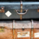 Alte Koffer aus den 1940er Jahren stapelten sich auf der Bahnhofsplattform, die von den Besitzern gesammelt werden kann. England UK.