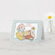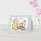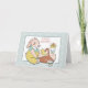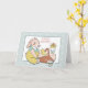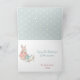 Auf der Vorderseite dieser hübschen Osterkarte befindet sich ein altmodischer Osterhasen in aquamarinem Grün und Gelb, der neben einem Korb sitzt. Im Korb ist ein kleines gelbes Küken. Der Text oben sagt "Happy Oaster" in weichem Rosa. Ein Musterrahmen umschließt Bild und Text. Im Inneren gibt es mehr anpassbare Textfelder in Rosa und Pastellgrün aquamarin. Es gibt ein anderes Bild vom Hasen mit einer Gießkanne unten.