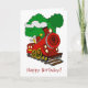 Ein niedlicher Cartoon-Zug mit der Nummer 9 vorne und Rauch aus dem Stack und Bäumen im Hintergrund.