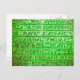 Eine Postkarte mit antiken Schriftzeichen, die auf Stein in Grün graviert sind. Auf den links kann man Risse sehen.