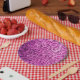 Ein Set aus lila Tellern mit antiken Hieroglyphen, die auf Stein graviert sind. Machen Sie ein Set mit passenden Papierservietten, Papierservietten, Papiertassen und tränenreichen Tischsets! Auch in anderen Farben erhältlich: blau, grün, rot und gelb. Gut für Halloween-Partys.