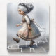 Alte Dame mit grauem Haar und einer Schürze, die auf Kreidespiel hoppt