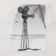 Old Movie Zeit Vintage Filmkamera auf einem Sandstrand schwarz-weiß Illustration Druck.
