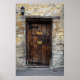 Plakatdruck einer alten Holzfront in einer Steinfassade eines Hauses mit Licht über dem Eingang.