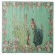 Alte modische Keramik Tile mit kinderfreundlichen, sonnigen und spielerischen Rose das ganze Set vor einem Holzboden. Diese individuelle Kachel ist das ideale Geschenk für Menschen, die Vintage Gegenstände mögen.