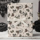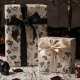 Dieses lustige feminine Gothic-Packpapier wird von Nathalie Portet in schwarzer Tinte gezeichnet und zeichnet sich durch skurrile Skulls, blütenfarbene, rosa und cremefarbene Rose und Spinnennetze vor einem antiken, weißen Hintergrund aus.