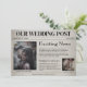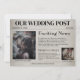 Dieses einzigartige Save the Date für die Hochzeitseinladung bietet ein altes Zeitungsmotiv. Der Hintergrund weist ein verblasstes Muster auf, das einer Zeitung ähnelt. Die Überschrift "spannende Neuigkeiten" ist über Beispielartikel über den Vorschlag und das Datum der Hochzeit gedruckt. Auf dem links Bild wird ein Bild des Paares angebracht. Der untere Teil enthält einen zusätzlichen "Weekend Update"-Bereich, in dem das Paar sein Haustier oder etwas Besonderes hervorheben kann, sowie ein eigenes Foto für Haustiere oder ein anderes Bild.