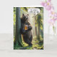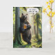 Ein Bär steht leise gegen einen Baum, der eine Tasse Bier mit einer Pfote in einem sonnenbeleuchteten Sommerwald mit einer humorvollen Sprechblase hält. Alle Texte können bearbeitet werden.
