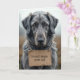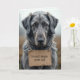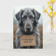 Ein großer, grauer Retriever-Hund mit ausdrucksvollen Augen hat ein leeres Pappschild um den Hals, um alt zu werden. Alle Texte können geändert werden.