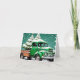 Alter grüner LKW mit einem Weihnachtsbaum im Hintergrund, verschneit.
