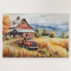 Dieses Puzzle ist ein wunderschönes Puzzle mit Vintager Kunst für den seriösen Puzzler, der Landschaften, alte Scheunen oder Vintage Lieferwagen-LKWs Liebe, und hat große Gräser im Spätsommer auf einem Feld, wo ein alter roter Lieferwagen mit einer roten Scheune und Hügeln im Hintergrund geparkt ist, alles in einem Herbstumfeld.