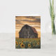 Alte rustikale Holzhütte in gelben Sonnenblumen mit Sonnenuntergang