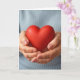 Eine ältere Frau, die einen weichen blauen Pullover trägt, hält sanft ein rotes Herz in ihren Händen.