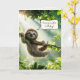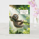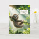 Ein niedlicher Faultier hängt von einem Baumzweig umgeben von üppig grünen Blätter, von dem das Sonnenlicht durch den Baumkronen strömt. Alle Texte können geändert werden.