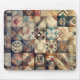 Es wird ein verblasster Stepptisch mit verschiedenen Patchwork-Mustern angezeigt, auf dem jedes Quadrat verschiedene Designs und Stoffe aufweist.