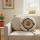 Schönes dekoratives Rundkissen mit einem aztekischen Sonnen-Gesicht und Illustrationen mit Text. Schöne Vintage-Kunst mit einem Boho-Stil-Fusions-Vibe. Fügt Ihrem Zuhause einen künstlerischen Schwung und einen Hauch alter Kultur hinzu. Betrachten Sie es auch als stilvolles Geschenk für ein kreatives Haus zur Einweihung.