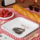 Papier Teller mit einer Illustration eines alten Vintagen Dampfzuges. Die Einrichtung ist mit den Weihnachtsliedern in Rot dekoriert.