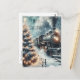 Personalisierte Weihnachtspostkarte. . Altmodischer Vintager Retrozug in einer wunderschönen schneebedeckten Winterlandschaft mit Kiefernbäumen mit beleuchteten Weihnachtslichtern.