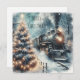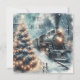 Personalisierte Weihnachtskarte. . Altmodischer Vintager Retrozug in einer wunderschönen schneebedeckten Winterlandschaft mit Kiefernbäumen mit beleuchteten Weihnachtslichtern.