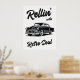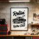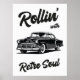 Feiern Sie die Eleganz der Vergangenheit mit dieser beeindruckenden Schwarzweiß-Grafik mit einem Oldtimer und dem Satz "Rollin" mit Retro-Soul." Die minimalistische Farbpalette hebt die aufwändigen Details des Autos hervor und macht es zu einem perfekten Stück für Liebhaber klassischer Automobile und raffinierten Designs.