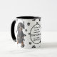 Ein hübscher, schwarz-bräunlicher Hund sieht auf beiden Seiten dieser Tasse neugierig aus. Der Text zwischen den beiden Bildern sagt: "Am 8. Tag erschuf Gott die DACKEL und nannte sie SEHR GUT". Die Hundebilder und das weiße ovale Banner mit den Textfeldern werden auf einem weißen Hintergrund mit schwarzen Pfoten platziert. Niedlich!