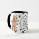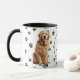 Ein wunderschöner Golden Retriever Hund sieht dich von beiden Seiten dieser Tasse aus an. Der Text zwischen den beiden Bildern sagt: "Am 8. Tag erschuf Gott den GOLDEN RETRIEVER und nannte ihn SEHR GUT". Die Hundebilder und das weiße ovale Banner mit den Textfeldern werden auf einem weißen Hintergrund mit schwarzen Pfoten platziert.