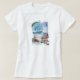Der T - Shirt dieser wunderschönen Frau enthält ein Gemälde des weltberühmten Künstlers Danny Hahlbohm. Dieses Kunstwerk ist sicher ein Sammlerstück. Es zeigt ein Gemälde von Danny Hahlbohm mit dem Titel "By the Seashore" mit Muscheln, Meerjungfrauen, Wellen, Strand und Möwen.