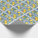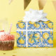 Es handelt sich um ein Zitronenmuster im mediterranen Stil mit einer Mischung aus handgemalten Zitronen, Ästen und dekorativen Keramiken. Die hellgelbe, weiße und kobaltblaue Farbpalette erinnert an ein sonniges Küstenambiente.