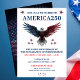 Feiern Sie einen einmaligen Meilenstein mit dieser America250-Party-Einladung zur Feier, die geschaffen wurde, um den 250. Jahrestag der Vereinigten Staaten am 4. Juli 2026 auf weißem Hintergrund mit Amerikanischem Adler in den Farben Rot, Weiß und Blau zu ehren. Perfekt für patriotische Partys, Gemeindeveranstaltungen, Nachbarschaftsfeiern und historische Gedenkveranstaltungen, setzt diese Einladung den Ton für einen bedeutungsvollen und festlichen Unabhängigkeitstag. Entworfen, um Amerikas Semiquincentennial zu würdigen, hebt sie nationalen Stolz, Tradition und Zusammengehörigkeit hervor und lädt Gäste ein, einen unvergesslichen Abend mit großartigem Essen, lebendiger Gesellschaft und Feuerwerk zu genießen. Einfach zu personalisieren, indem Sie einfach Ihre Veranstaltungsdetails hinzufügen, um eine professionelle, auffallende Einladung in sowohl gedrucktem als auch digitalem Format zu erstellen. Ideal für Gastgeber, die eine patriotische