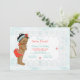 Adorable Vintage Baby in einem roten Anzug mit Blume Kopfband. Aqua Aqua Aqua Hintergrund und Spitzen Rahmen mit kleinen roten Blume. Auf der Rückseite der Einladung befindet sich ein Spitzen-Monogramm-Bereich für eine benutzerdefinierte Nachricht. Ideal für Kinder-Geburtstagsparty, Schwimmbad-Party, Babydusche oder Babyankündigung.