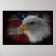 Der Nationalvogel der USA, der majestätische Glatzenadler vor einem verwitterten und zertäterten Fahnenhintergrund. Großes patriotisches Bild.