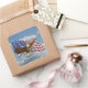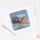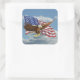 Ein quadratischer Aufkleber mit einem Bild einer schwingenden amerikanischen Flagge und einem kahlen Adler im Flug gegen einen wolkigen blauen Himmel. Siehe dazu passende Vinyl-Aufkleber, Konfetti, Gefälligkeitsbeutel, Gefälligkeitstafel, Gefälligkeitstafel, Geschenktaschen, Etikett und Packpapier. Sehen Sie sich die gesamte Patriotic 40s-Aufklebersammlung im INVITES an. | Aufkleber und Etiketten.