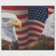 Der majestätische Bald Adler vor der amerikanischen Flagge. Perfekt für patriotische Feiern wie Veteran's Day und Unabhängigkeitstag/4. Juli. Realistische Kunstwerke aus einer originalen Ölgemälde von Fauna und Pferdekünstler Crista Forest. Weitere Informationen finden Sie unter ForestWildlifeArt.com.