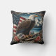 Ein majestätischer Glatzadler steht auf einem Baumzweig und überblickt einen ruhigen Bergsee mit amerikanischer Fahne und floralen Akzenten im Hintergrund.