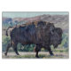 Ein imposanter amerikanischer Bison mit seinem robusten Mantel und seiner kraftvollen Haltung, der inmitten landschaftlicher Grasflächen spaziert. Die umliegende Umgebung bereichert die wilde Schönheit dieses typisch nordamerikanischen Tieres. Kunstwerk von Sally Lannier/Pinted Dreams Designs