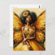 Diese Postkarte ist mit einer dunkelbraunen Fee mit einem großen Schmetterlingsflügel ausgestattet. Eine afrikanische Diaspora Sonnenblumenmärsche von Dee Claire. Das fantasievolle Wesen trägt ein gelbes Kleid und ergänzt die helle, sonnige, sommerliche Ästhetik. Sie trifft eine selbstbewusste Pose. Ideal für Fans verschiedener Fee.