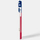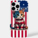 Eine niedliche Katze mit einem Fellmuster, das der amerikanischen Flagge ähnelt. Die Katze hat orangefarbenes und weißes Fell mit blauen Augen auf der links Gesichtsseite mit weißen Sternen. Seine Augen sind groß und grün, und es hat einen spielerischen Ausdruck. Der Körper ist in rot und weiß gestreift, nachahmt das Fahnen-Design, der Hintergrund ist Amerika Fahne Farben.