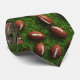 Ein sich wiederholendes Muster brauner, strukturierter amerikanischer Fußbälle mit weißen Schnürsenkeln wird auf einem grünen, strukturierten Gras dargestellt. Die Fußbälle sind gleichmäßig verteilt und in verschiedene Richtungen ausgerichtet, wodurch ein durchgängiges und nahtloses Design entsteht. Das Muster ist visuell konsistent, jeder Fußball und jede Grashalde werden detailliert gerendert. Ideal für Sportler.