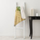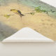 Ein kleiner, Vintager Finch, der auf einem Zweig mit grünen Blätter steht. Dekorativer, bedrückter, gelber, grüner und staubiger lila taupe abstrakter Hintergrund mit an den Rändern verstreuten Blattmotiven. Dieses Vogel- und Blattdesign entwarf ich, beginnend mit meinem eigenen Foto einer gelben Finke auf einem Zweig, kombiniert mit digitalem, dekorativem Grafikdesign.