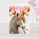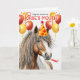 Gelbe und rote Farbpalette mit Geburtstagsballons, Party-Hut und Gebläse mit diesem süßen Kastanienbadepferd, um den Western Geburtstagswünsche zu senden.