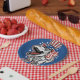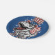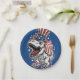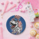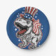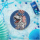American Patriotic Dinosaurier, eine faszinierende und lebendige Illustration eines kartoonischen, vektorkunsthistorischen Designs eines wilden Dinosauriers mit einem niedlich spielerischen Verhalten. Der Dinosaurier wird mit einem breiten Mund dargestellt, der offen ist, um seine für Kinder niedlichen Zähne zu zeigen. Auf seinem Kopf steht ein amüsant patriotischer Tophut, der mit den US Flagge der amerikanischen Fahne geschmückt ist. Der Dinosaurier selbst wird in auffallendem Weiß gerendert und steht in scharfem Kontrast zum schwarzen Hintergrund. Der Hut mit roten und weißen Streifen mit weißen Sternen auf einem blauen Feld verleiht eine unerwartete und skurriotische patriotische Touch. Die illustrierte Figur und der Hut werden durch kühnen Konturen definiert, die die Aufmerksamkeit des Betrachters gezeichnet haben und eine spielerische und dennoch animierte Atmosphäre schaffen. Die einzigartige Kombination von Elementen in diesem Design ergibt ein humorvolles und lebendiges Bild, das die Zuschauer begeistern wird.