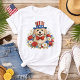 This heartwarming patriotic design features a fluffy, wide-eyed puppy dressed in classic Americana style, complete with a tall Uncle Sam–inspired top hat adorned with stars and a cheerful red bow tie. Framed by elegant red, white, and blue florals with soft gold accents, the illustration blends vintage charm with whimsical sweetness.