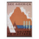Vintage Illustration USA Reiseplakat aus Montana mit einheimischen Amerikanischen Ureinwohnern, Bergen, Seen und Bäumen. Text lautet: See America, Welcome to Montana.