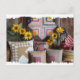 Ein wunderschöner Rahmen mit primitiven Antiquitäten wie einem Holzsteg, ca. 1860, Gelbwaren-Kronen, Sonnenblumen und einem Kissen aus lebendem Quilt gegen Barnwood.