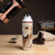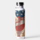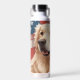 Auf dieser Getränkeflasche steht ein schönes Gemälde eines Golden Retriever vor der roten, weißen und blauen Flagge der USA.