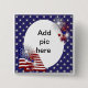 Kennzeichnet ein vibrent blaues Feld mit weißen Sternen, die amerikanische Flagge und bunte Feuerwerke, zeigen stolz Ihren pic auf diesem patriotischen Knopf an. Leicht personalisiert.